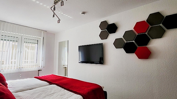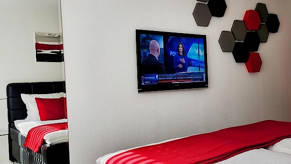 Schlafzimmer mit Boxspringbett 2 x 2 Meter, Spiegelschrank, 40 Zoll-LED-Fernseher mit Full-HD DVB-C und DVB-T-Tuner, SRS TruSurround und zahlreichen Anschlussmöglichkeiten wie USB, HDMI usw.