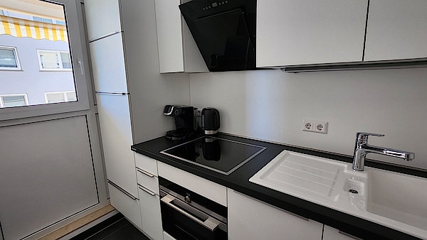 Voll ausgestattete Küche mit Induktionskochfeld, Backofen mit eingebauter Mikrowelle, Geschirrspüler, Kühl-Gefrier-Kombination, Kaffeemaschine, Elektrogeräten und Geschirrausstattung